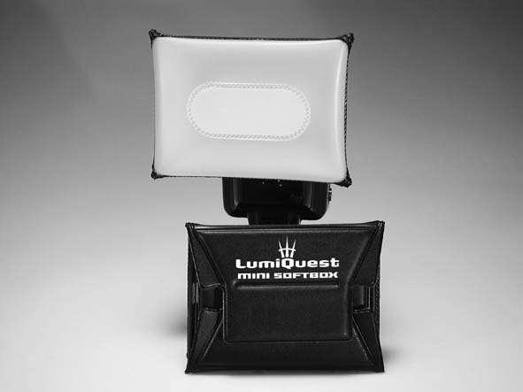 Lumiquest LQ108 Blesk je v základní poloze, rovnoměrnější rozptýlení a nasměrování světla přes ledovaný difužér. Díky menším rozměrům není efekt tak výrazný jako u Soft Boxu. Ideální pro menší blesky, nebo pro situace, kde by velikost SoftBoxu byla překážkou. Přibližná světelná ztráta 1 clona. Rozměry po složení: 8 x 11,5 cm.