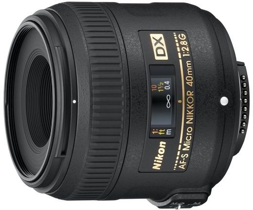 Nikon 40mm F2.8G ED AF-S DX MICRO Makroobjektiv formátu DX s ohniskovou vzdáleností 40 mm (ekvivalent u kinofilmu a formátu FX: 60 mm). Vysoká světelnost f/2,8. Měřítko zobrazení 1:1 pro makrosnímky v životní velikosti. Nejkratší zaostřitelná vzdálenost: 0,163 m. Ultrazvukový zaostřovací motor (SWM) pro přesné a tiché automatické zaostřování. Dva zaostřovací režimy: Režim M/A (automatické zaostřování s prioritou manuálního zaostření) pro rychlé přepínání mezi automatickým a manuálním zaostřováním a režim M (manuální zaostřování). Součástí dodávky objektivu je sluneční clona a měkké pouzdro.