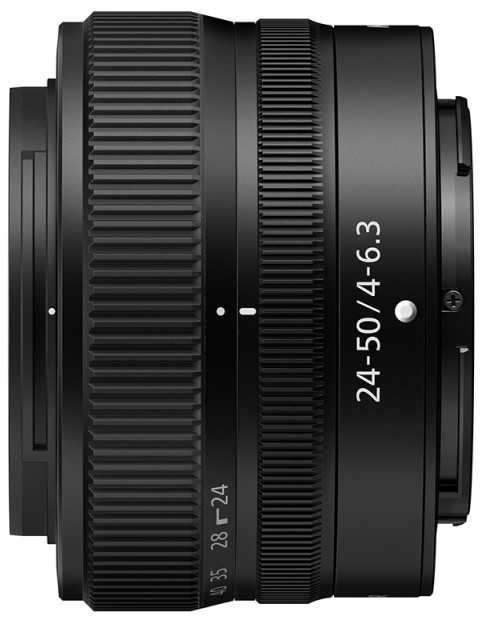 Nikon 24-50 f/4-6,3: velmi kompaktní Full-frame objektiv, určený pro CSC fotoaparáty (Z mount). Jeho rozsah ohniskových vzdáleností je 24–50 mm a světelnost f/4-6,3. Optická soustava obsahuje ED a asférické členy, které minimalizují zkreslení obrazu v celém rozsahu zoomu. Díky tichému krokovému ostřícímu motoru a minimální změně úhlu záběru během přeostřování, zaručuje profesionálně působící výsledky i při natáčení videa. Nejkratší zaostřitelná vzdálenost je 0,35 m v celém rozsahu zoomu. Přizpůsobitelný otočný kroužek lze využít pro nastavení clony, korekce expozice nebo citlivosti ISO. Průměr filtru 52 mm.