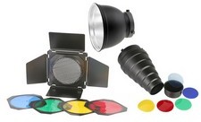 BASIC kit příslušenství: Reflektor 16,5 cm/Klapky + sada barevných filtrů + voština/Komínkový reflektor + voštinový filtr + sada barevných filtrů.